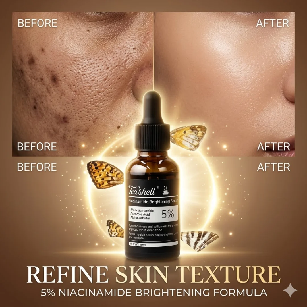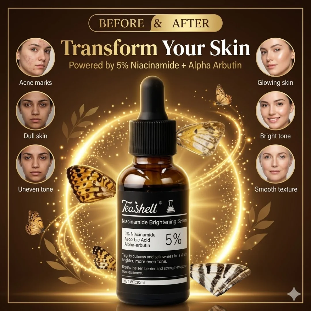 Reveal brighter, smoother, and more radiant skin with Teashell Niacinamide Brightening Serum—a powerful 5% niacinamide formula enriched with alpha-arbutin and ascorbyl acid. This targeted serum works to fade dark spots, reduce hyperpigmentation, treat acne marks, and even out skin tone while deeply hydrating and strengthening the skin barrier. Suitable for all skin types (normal, oily, dry, sensitive, combo, and acne-prone), it delivers a glowing, youthful complexion with consistent use.